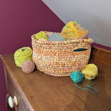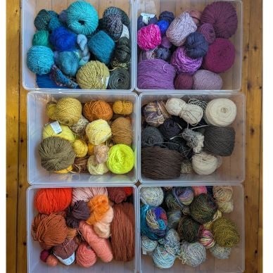 Pour maximiser votre motivation et votre inspiration à utiliser vos restes, je vous invite à trouver une méthode de rangement en alignement avec vos goûts et vos besoins. Pour ma part, je suis inspirée par les agencements de couleurs avant tout alors je range mes bouts de laine par groupes de couleurs sans me soucier de leur taille. Je range tout dans des bacs transparents pour garder mes trésors à l'œil. On ne sait jamais quand l'inspiration peut frapper! J'ai aussi tendance à isoler les fibres plus estivales (coton, viscose, lin, soie) dans une réserve séparée. Une tricoteuse en série de chaussettes pourrait avoir envie de garder tous ses restants de laine bigarrée au même endroit.