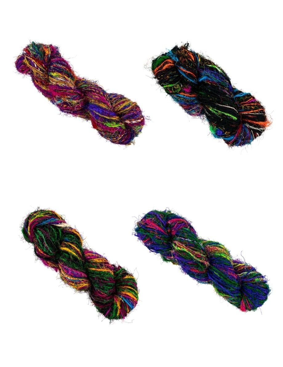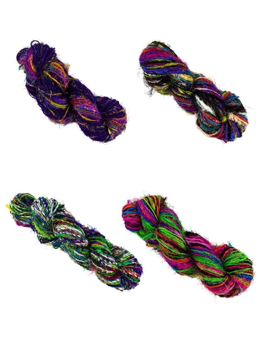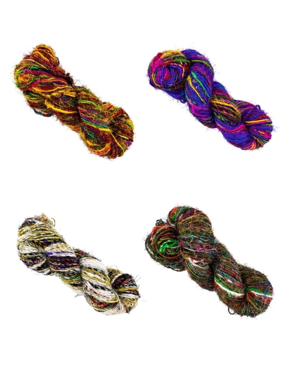100% brins de soie teints issus de saris indiens recyclés filés en un fil de poids variable (DK à Bulky)